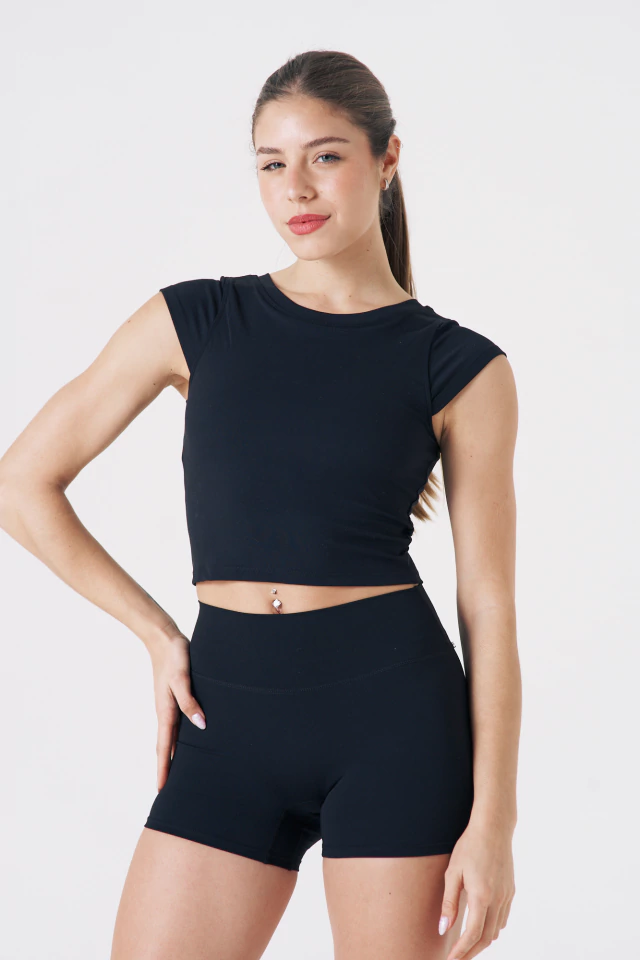 Una versión más cubierta, con mangas cortas tipo baby tee y también con un largo que nos favorece a todas. Al igual que la musculosa, tiene corpiño interno con tazas removibles y la misma compresión que sostiene y estiliza.